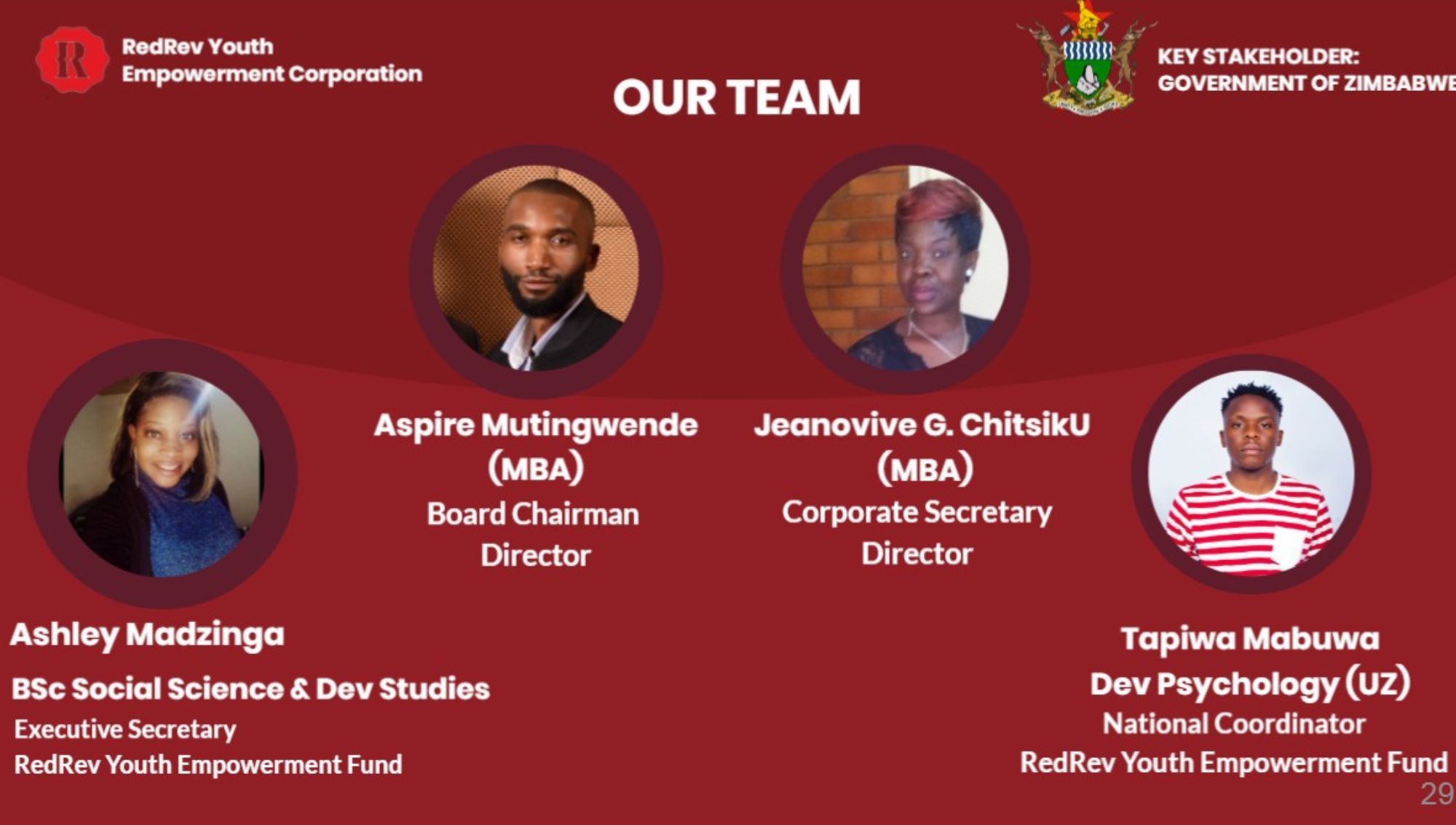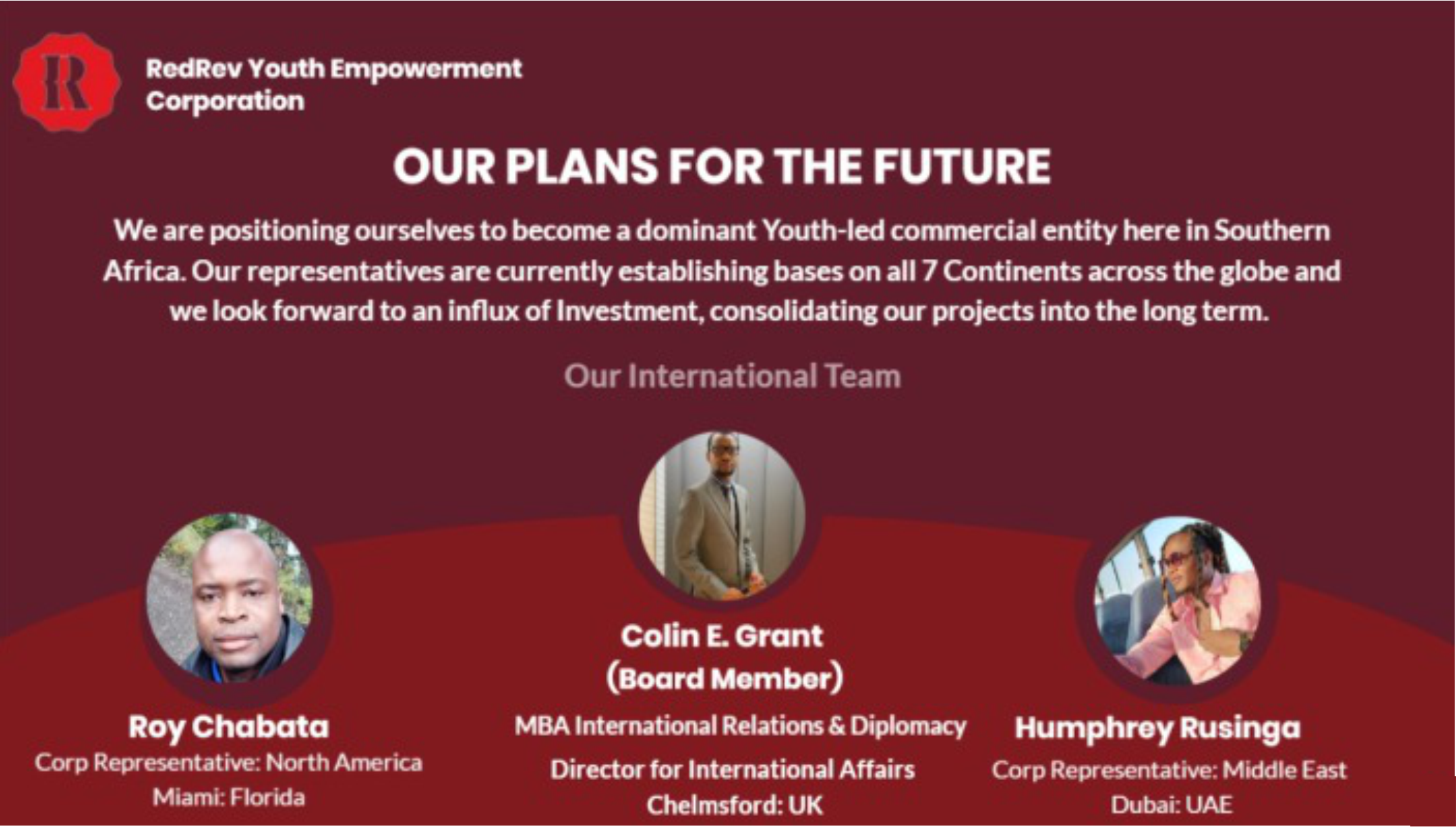 The RedRev Youth Empowerment Corporation was formed in 2018 by Children of War Veterans in Zimbabwe with the support of the Government. Our goal is to play a central role as the Youth in developing our great Nation into a middle-income Economy by the year 2030. Our investments vehicle currently has active commercial projects in the Sustainability (Green Economy), Mining and beneficiation, Agri-Business, ICT, Energy and Tourism sectors. We now have an Offshore Office in Chelmsford, UK, and active engagements are being made to engage with International Capital Markets to bring back investment in line with the Zimbabwe Open for Business Policy.